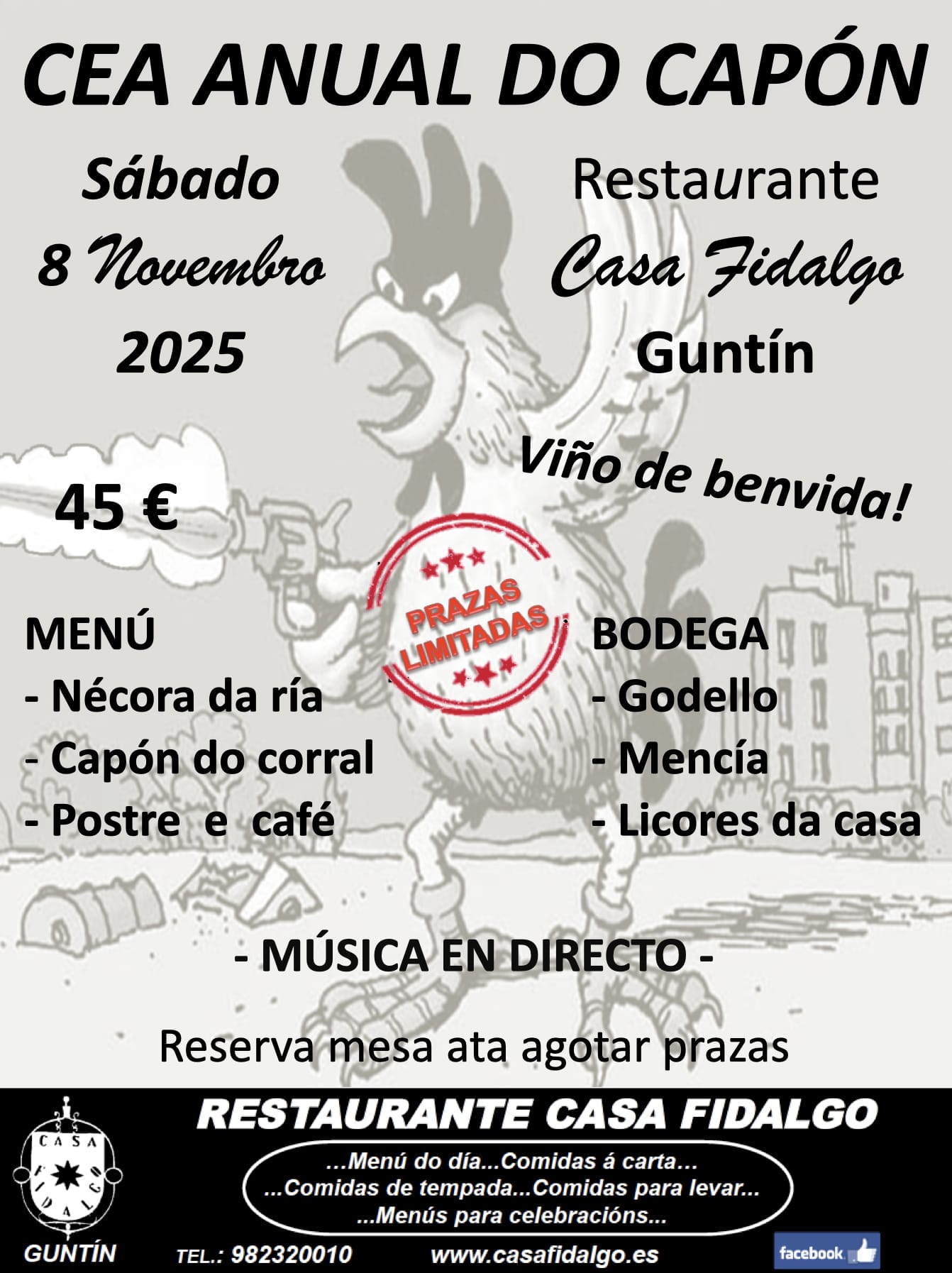 El menú consta de Nécora da Ría, capón de corral, postres, cafés y licores de la casa.